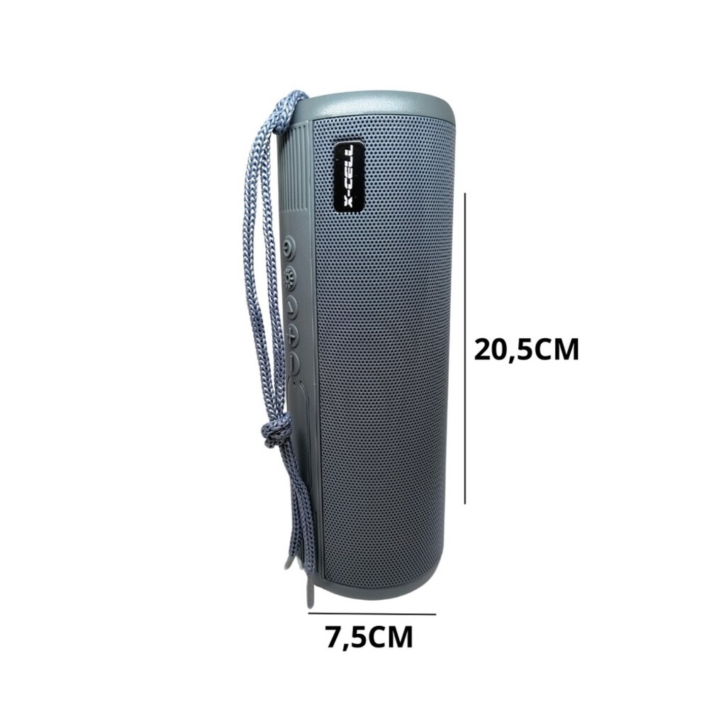 DESCRIÇÃO: - Caixa de Som Bluetooth - Cor: Cinza - Características Resistente à água IPX6 - Potência 20W - Permite emparelhamento entre 2 caixas (TWS) - FM /USB /TF/AUX - Lanterna Led - Bateria recarregável 3000 mAh - Autonomia: Até 4 horas - Composição: Plástico ABS e componentes eletrônicos - Conteúdo da embalagem: 1 caixa de som 1 cabo para recarga 1 cabo AUX