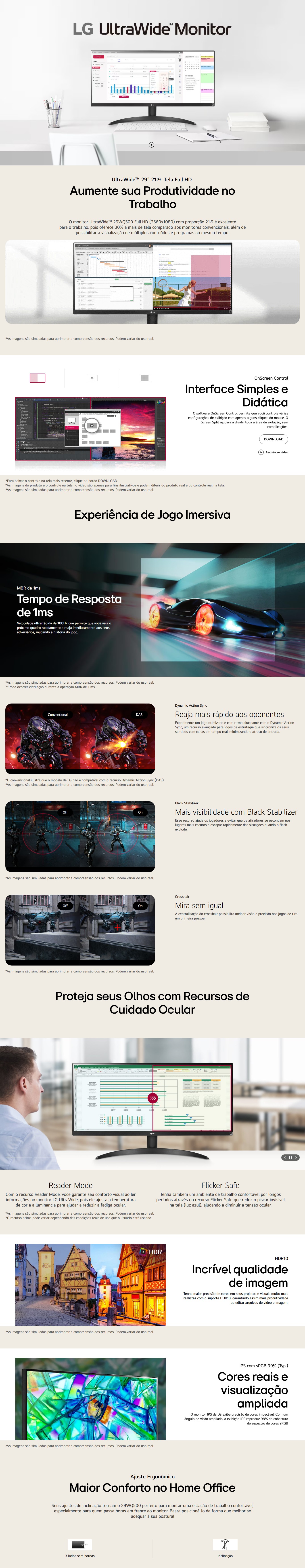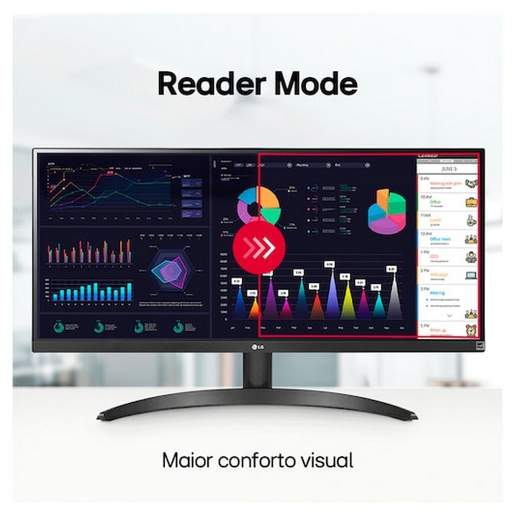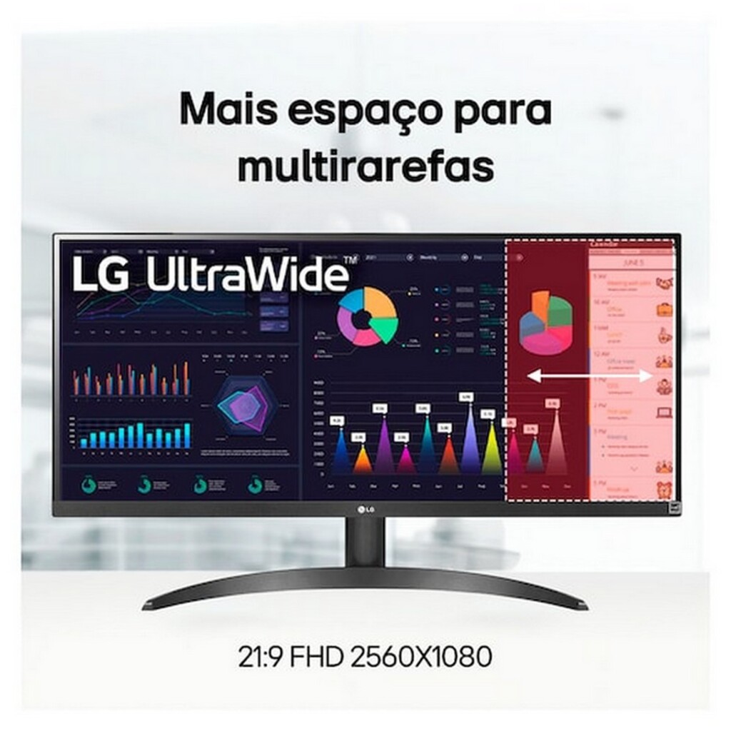 - O monitor UltraWide 29WQ500 Full HD (2560x1080) com proporção 21:9 é excelente para o trabalho, pois oferece 30% a mais de tela comparado aos monitores convencionais, além de possibilitar a visualização de múltiplos conteúdos e programas ao mesmo tempo.